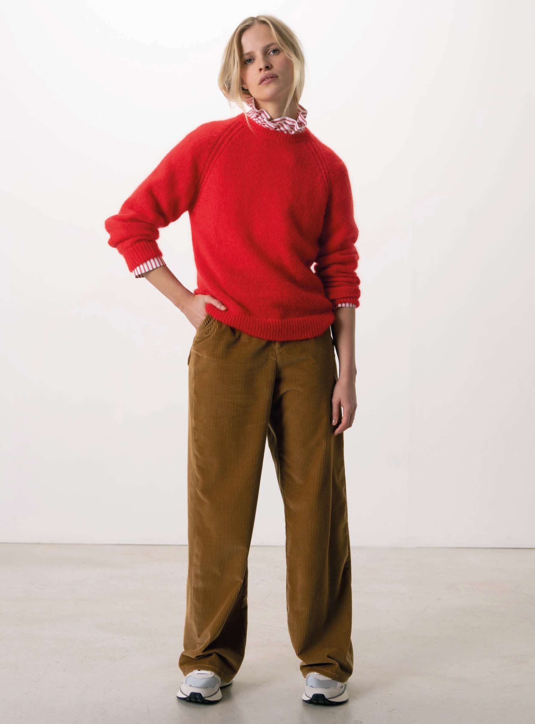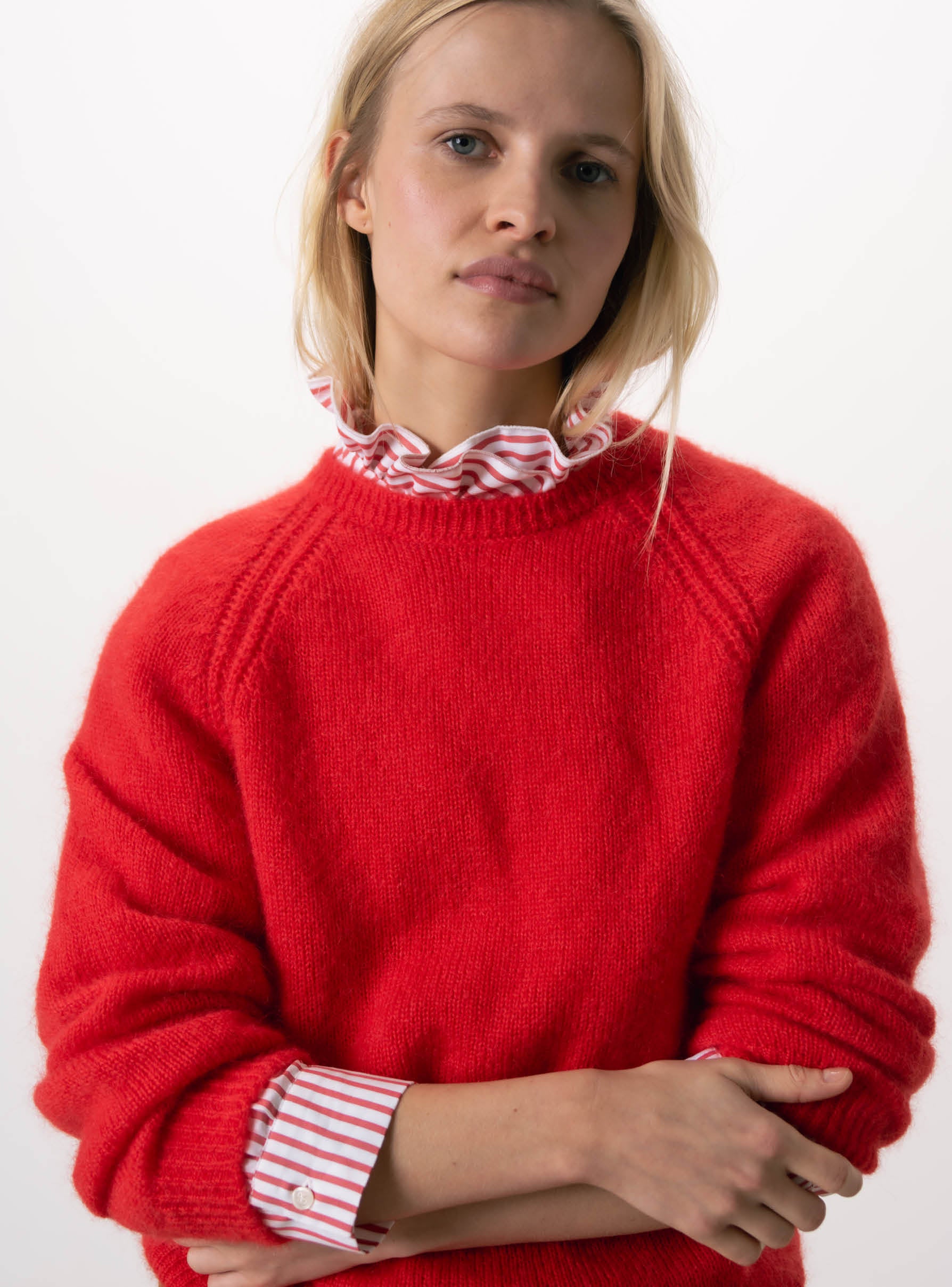 Maille mohair et merino, point jersey souple, matière douce et chaude.