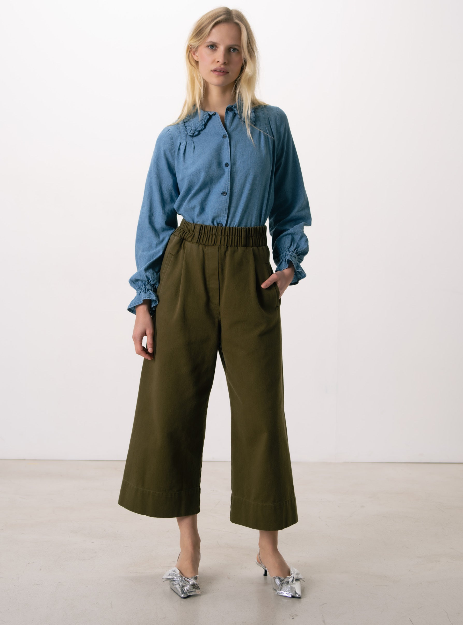 Manches droites et longues resserrées dans le bas par bande élastique, formant un large volant bas de manche.