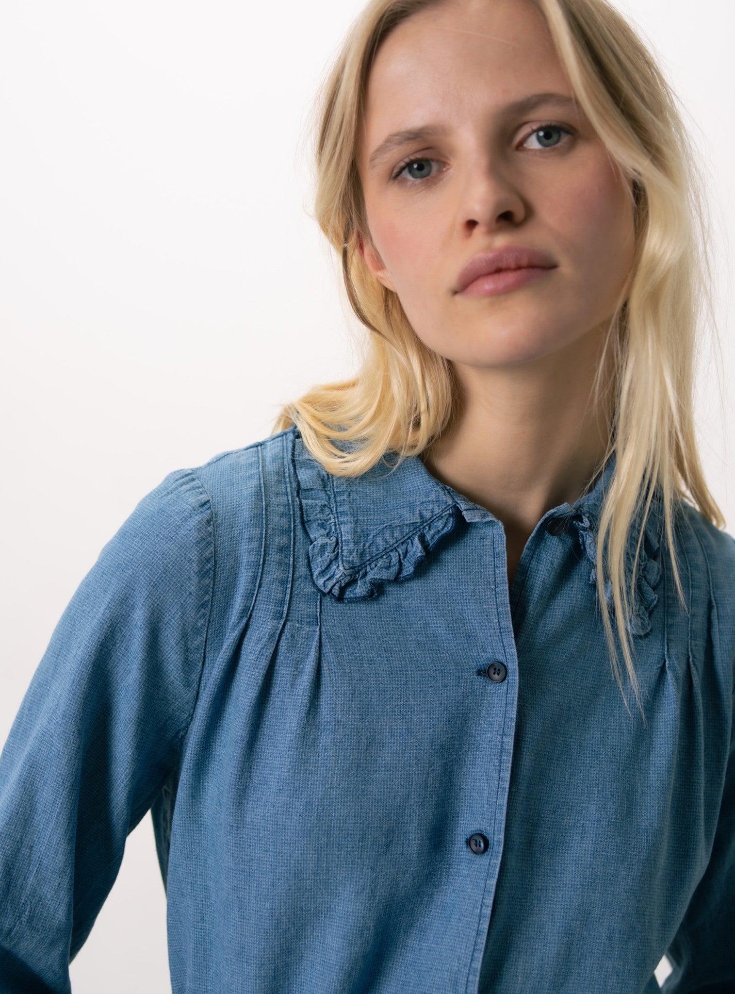 Col classique, avec un petit volant froncé tout autour, fini par petit point de bourdon.