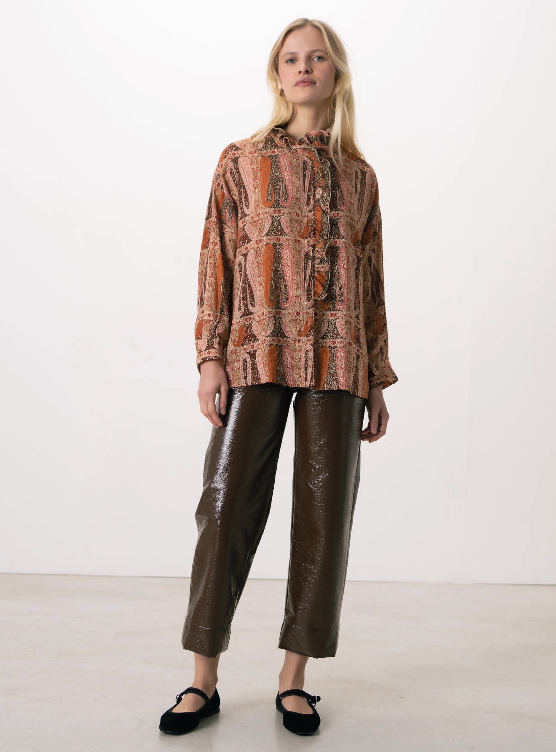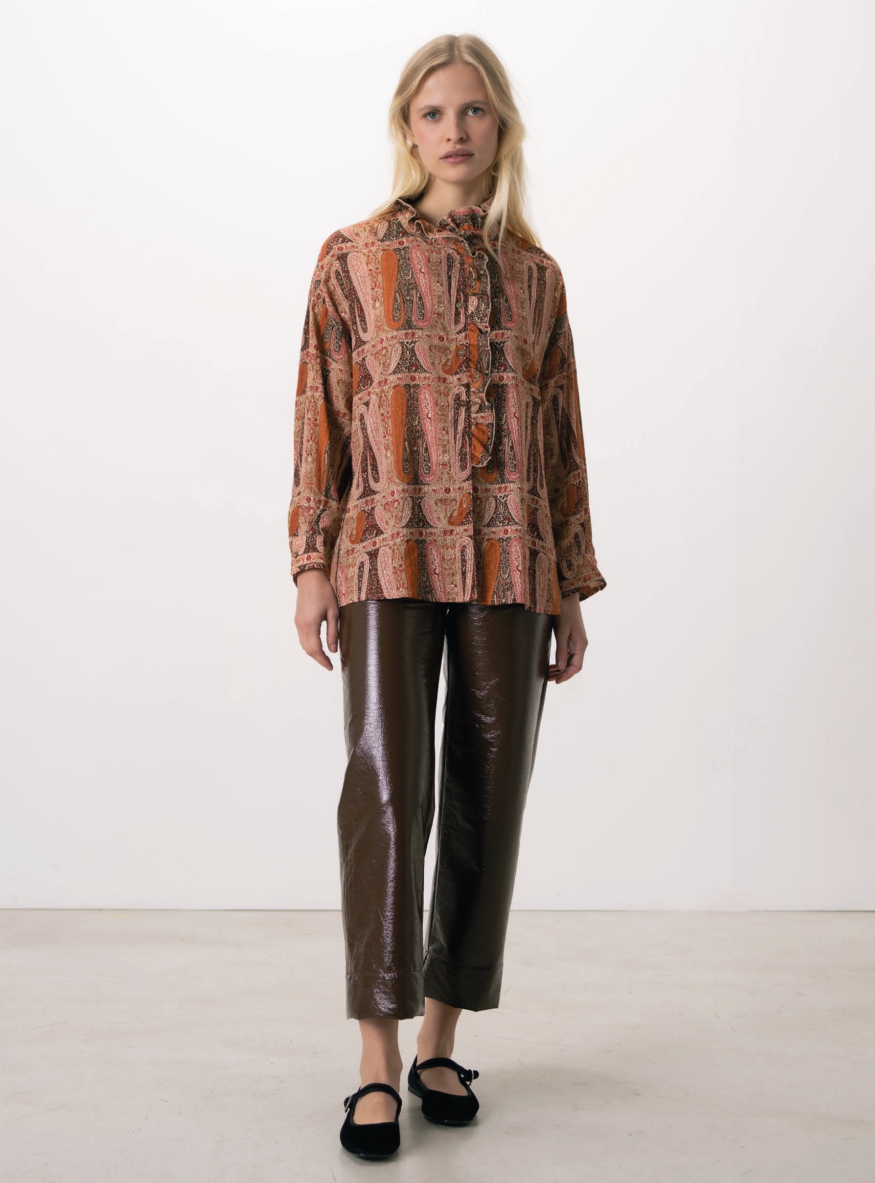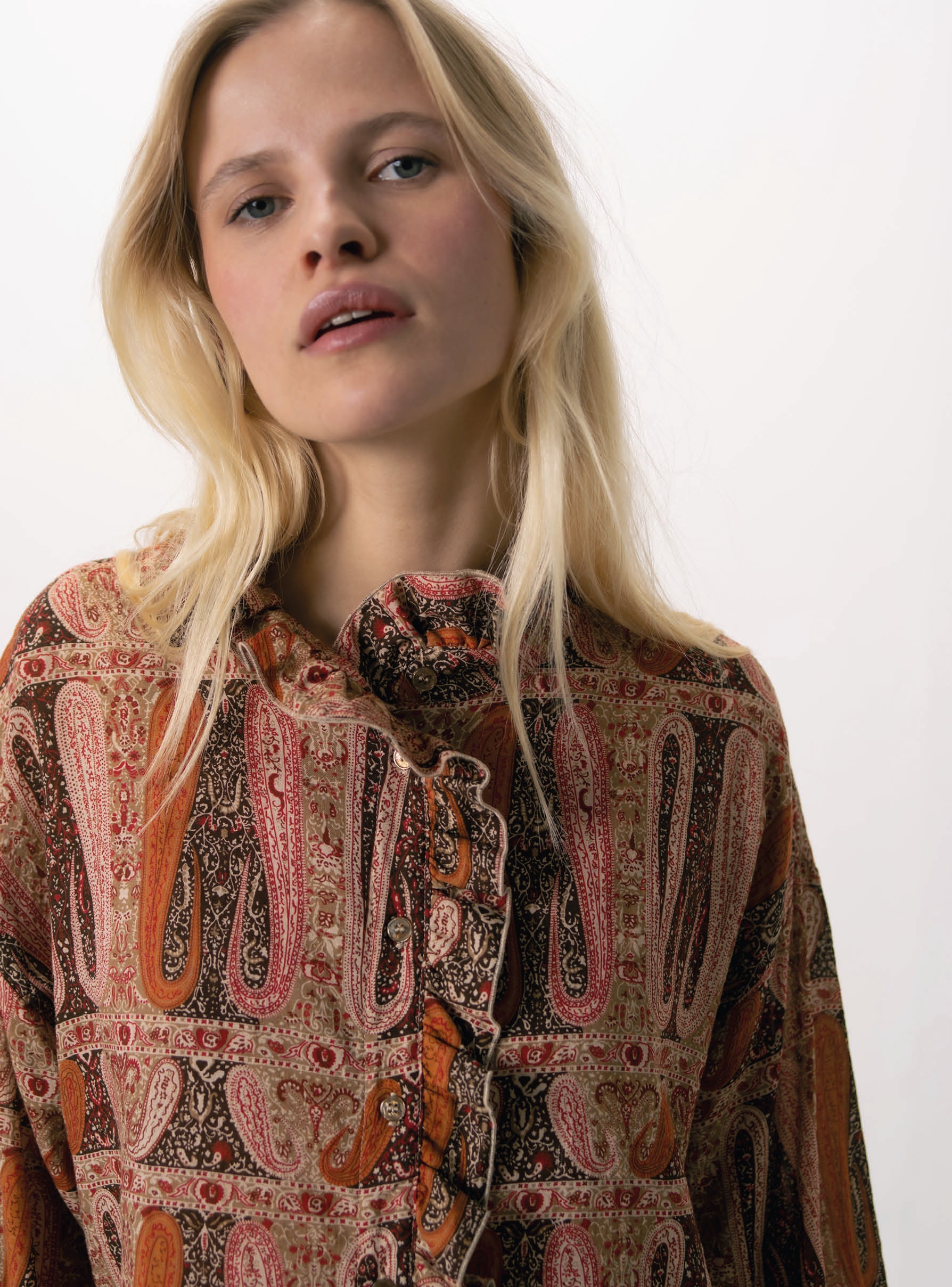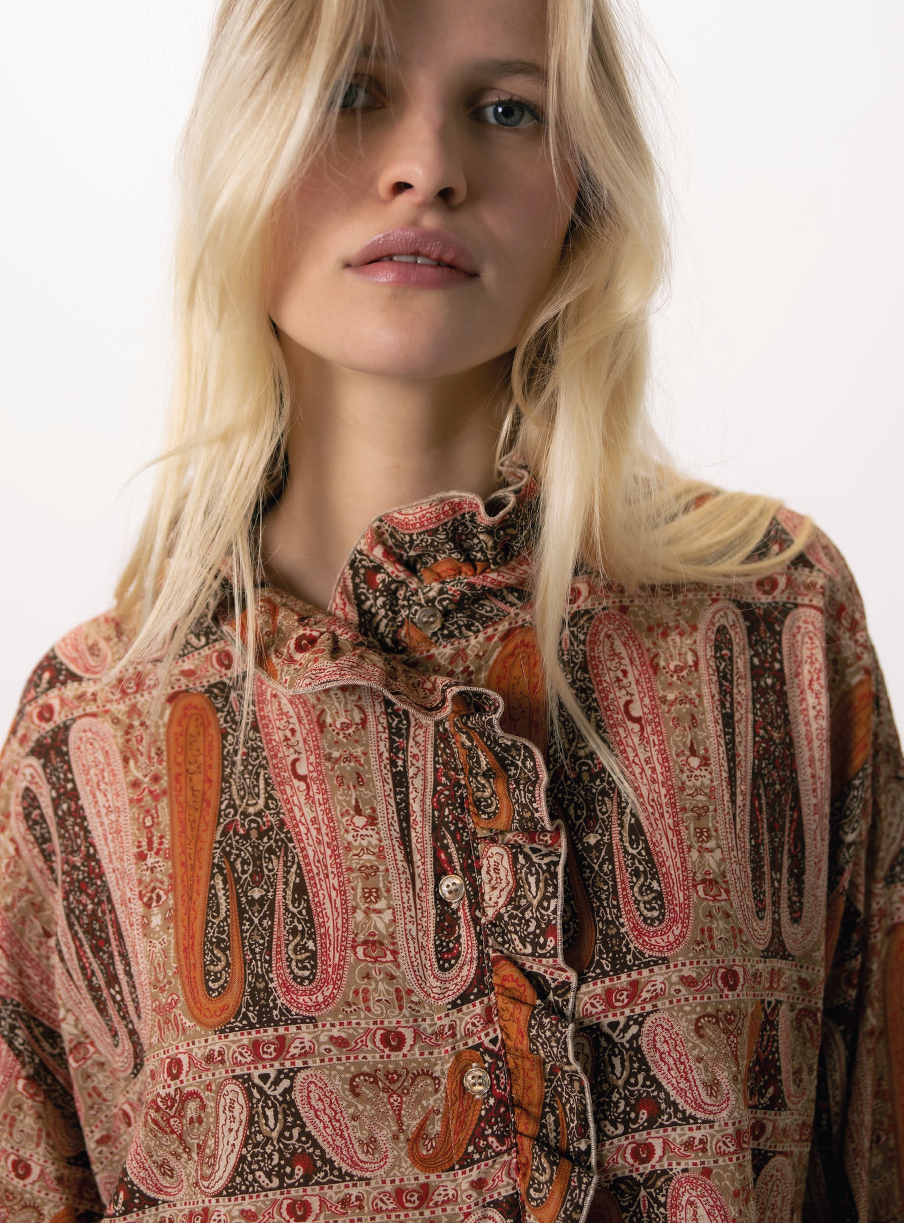 Un volant froncé tout autour de l’encolure, brodé d’un petit point de bourdon sur son bord. Le volant se prolonge le long de la patte de boutonnage.