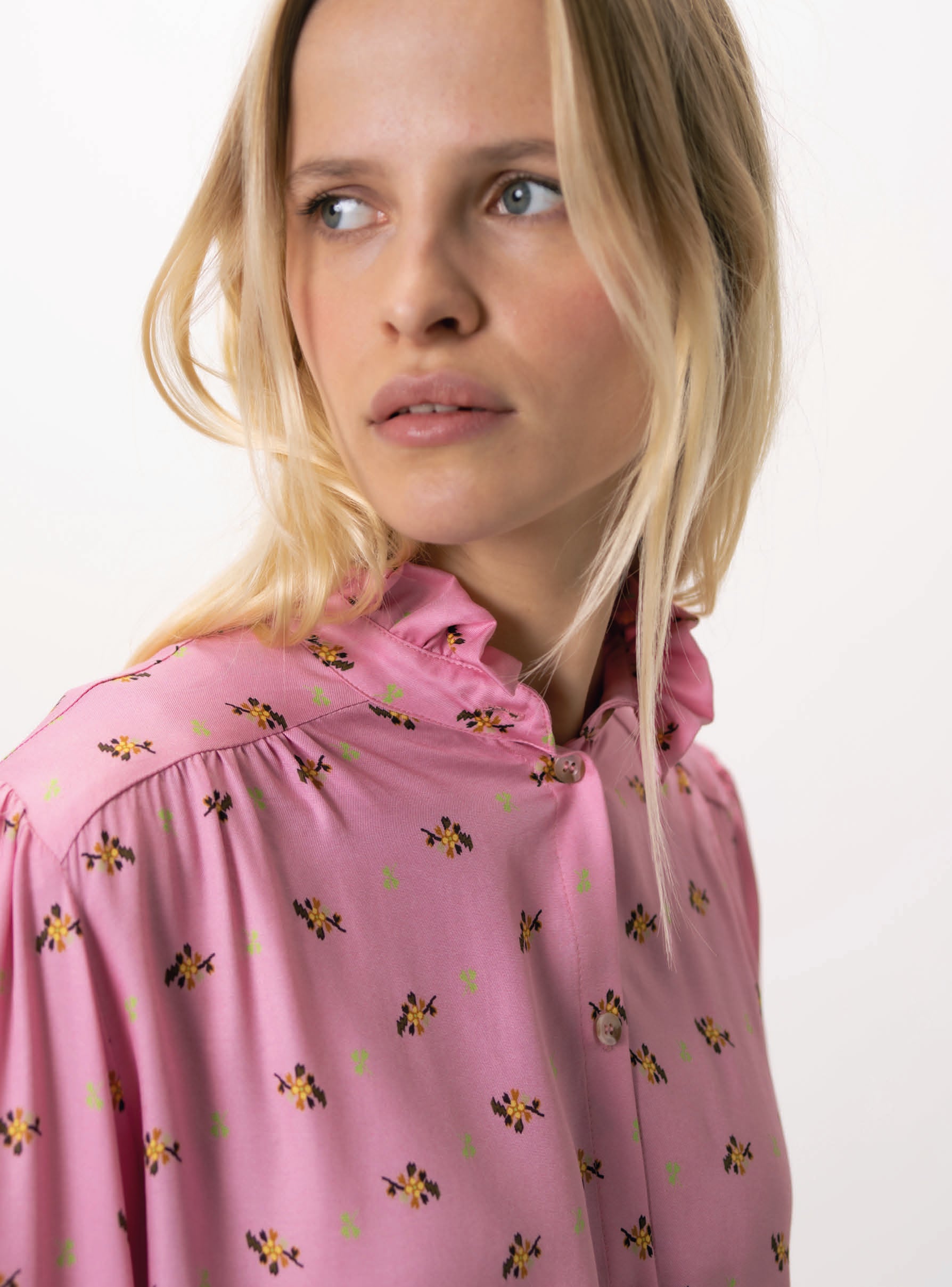 Encolure arrondie près du cou, avec un volant froncé en double tout autour.