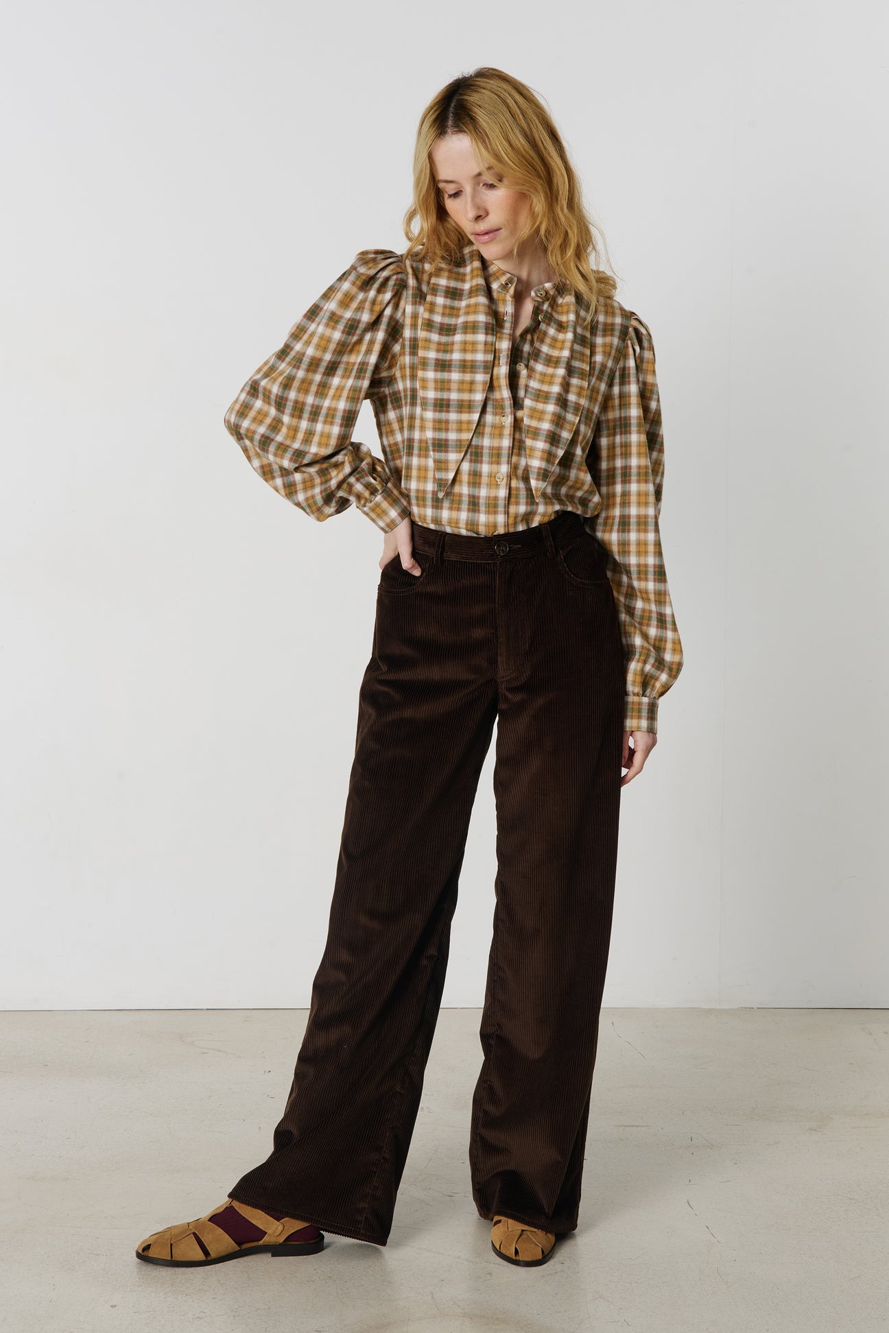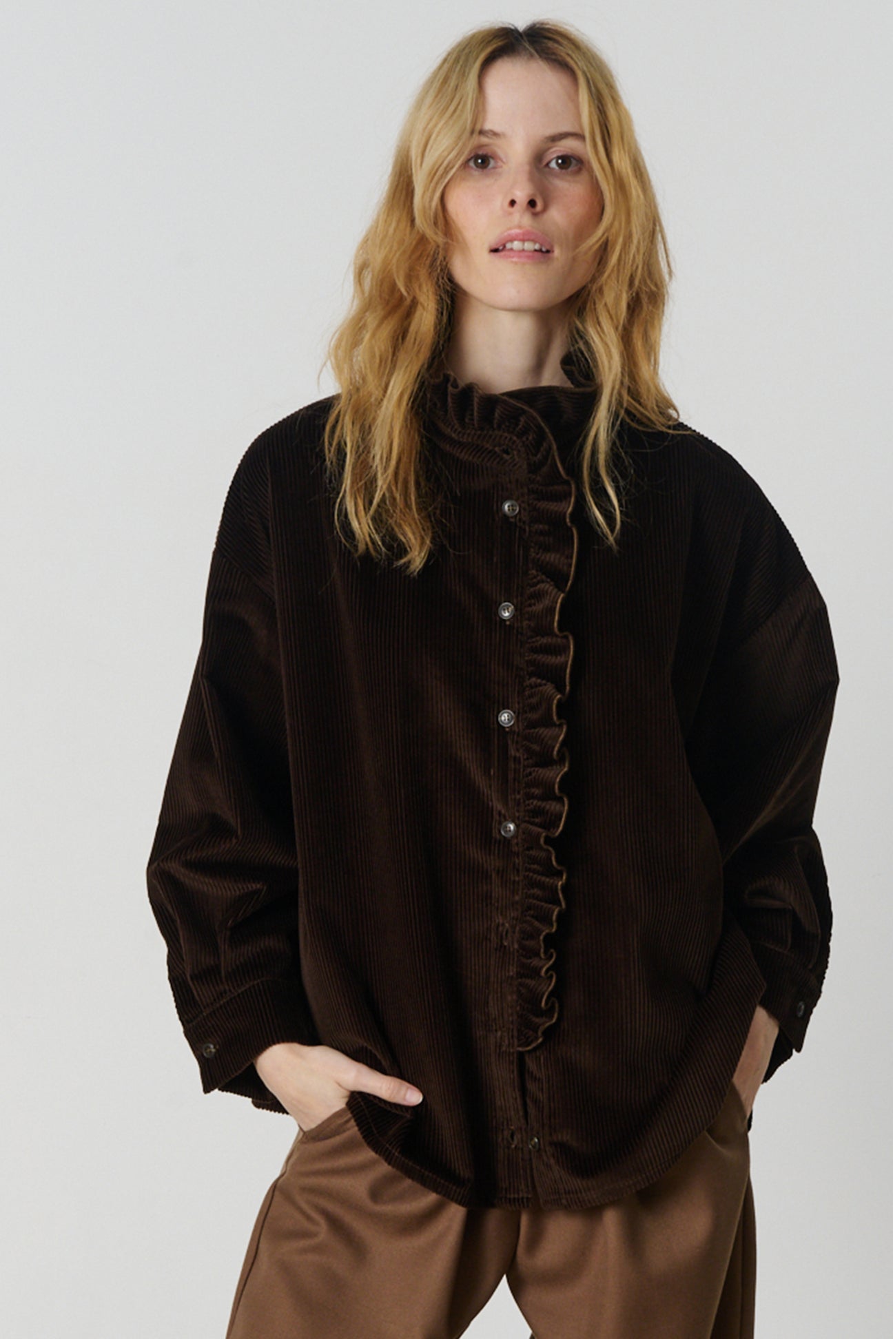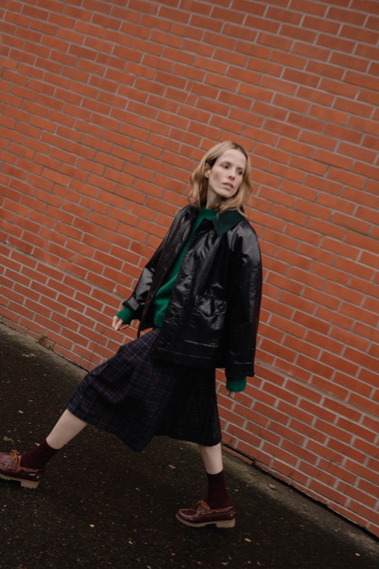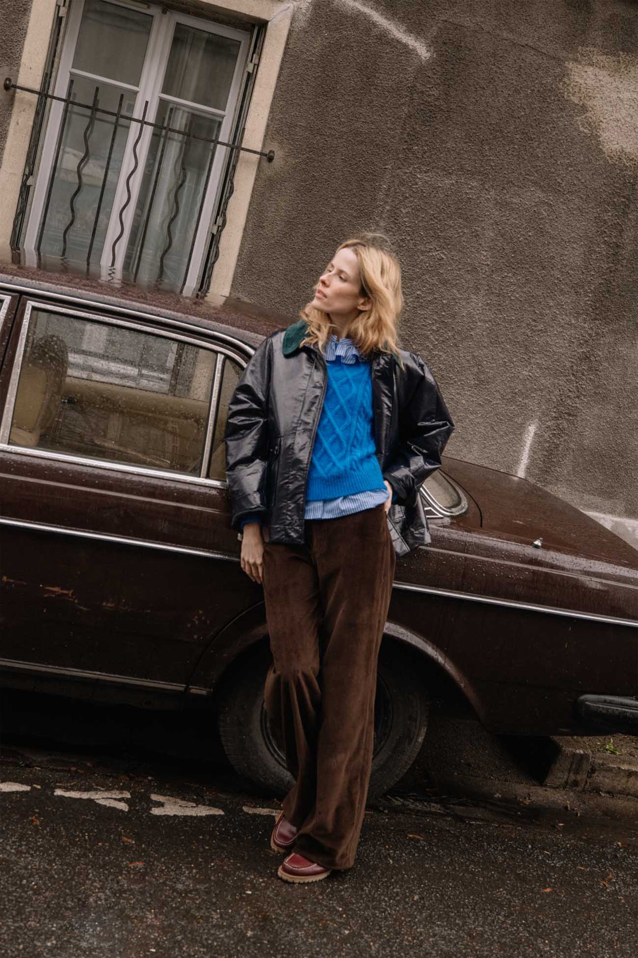 On y retrouve l’esprit d’une féminité libre et sans artifice. Le pantalon large en velours brun, les superpositions de mailles vives et de chemise rayée, le ciré brillant à col velours… tout évoque un vestiaire de ville, pensé pour affronter l’hiver avec style, mais sans effort. Des pièces fortes et réconfortantes, à porter comme une seconde peau.