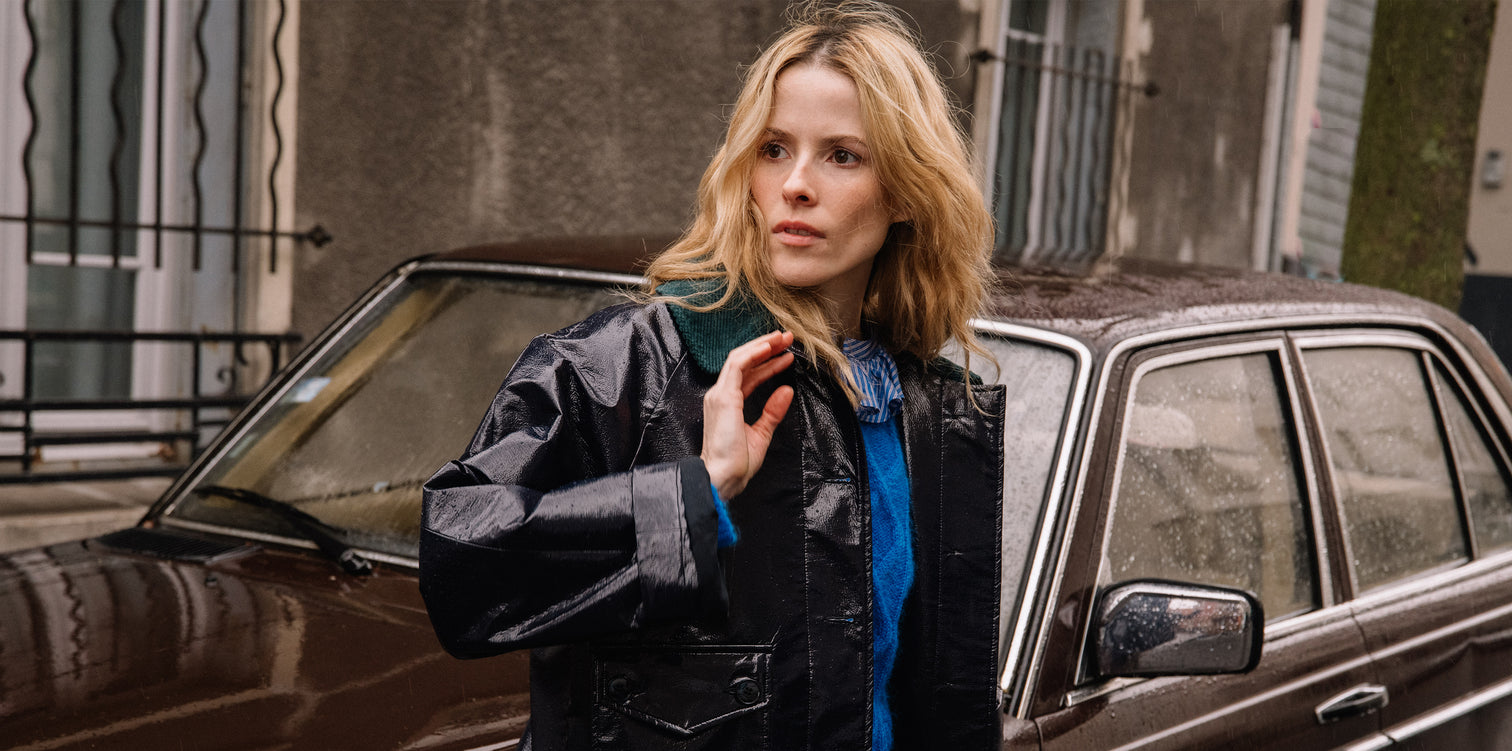 Une silhouette qui semble tout droit sortie d’un film français des années 70, figée dans un décor brut et mélancolique. Le mur texturé, la berline ancienne, la lumière grise et mouillée d’une rue parisienne : cette image condense l’atmosphère qui a nourri toute la collection.